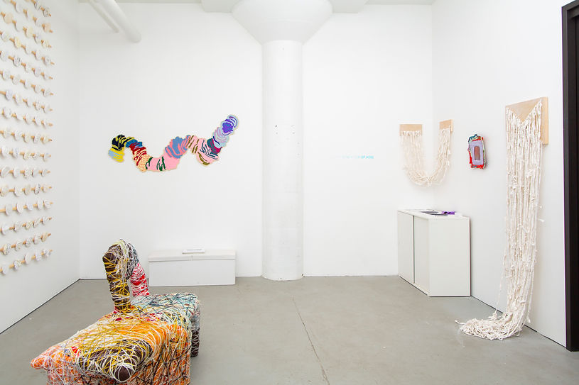 There Is No Lack of Void from left to right: Well Balanced People Don’t Feel the Need to Do This, Column 2, 2024, Lauren Iacoponi, Foam core, fabric, pins, zip ties, trim 96 units, 16 skewers, 4 x 10 feet; Foreground: Wrapped, 2023, Naomi Elson, chair, particle board, cardboard, foam, fabric, yarn; Slow Dance, 2024, Naomi Elson, Plastic bags and yarn; A Whisper For My Ears (Hoping I Might Reply), 2024, Lauren Iacoponi, Wood panel, fabric, plaster, Two 6 x 12 inches, 19 plaster strands; Lilac Haze, 2023, Naomi Elson, Frame, paper mache paste, yarn, latex paint, carpet backing, mod podge, fabric; Clumping Together What I Can, 2024, Lauren Iacoponi, Wood panel, fabric, plaster, 19.5 x 16 inches, 40 plaster strands